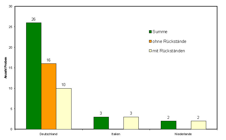 Zehn deutsche, die drei italienischen und die zwei niederländischen Proben hatten nachweisbare Rückstände an Pflanzenschutzmitteln. Eine Übersicht über die Ergebnisse gibt Abbildung 1.