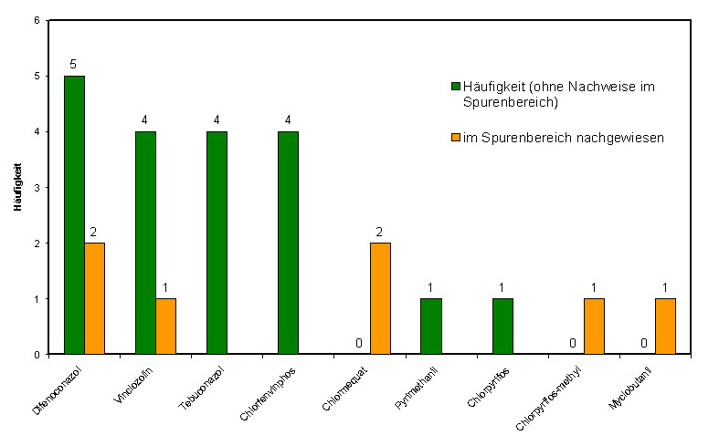 Abbildung 3 gibt eine Übersicht über die Häufigkeit der nachgewiesenen Wirkstoffe. Das Fungizid Difenoconazol wurde am häufigsten nachgewiesen. Die Fungizide Vinclozolin und Tebuconazol sowie das Insektizid bzw. Akarizid Chlorfenvinphos wurden ebenfalls in mehreren Proben gefunden. Die Wirkstoffe Chlormequat, Chlorpyrifos-methyl und Myclobutanil wurden lediglich in Spuren bestimmt.