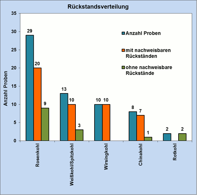 Erfreulicherweise wiesen 15 Proben (24,2 Prozent), darunter neun Mal Rosenkohl, drei Mal Weiß- und Spitzkohl, zwei Mal Rotkohl und ein Mal Chinakohl, keine Rückstände von Pflanzenschutzmitteln auf.