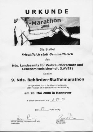 Bei sehr heißen Temperaturen fand am Mittwoch, den 28.05.2008 in Hannover der 9. Behördenmarathon statt. Trotz zahlreicher verletzungsbedingter Ausfälle konnte eine doch stark auftretende Staffel des LAVES präsentiert werden. Der Behördenmarathon ist ein jährlich stattfindender Staffellauf von niedersächsischen Behörden in Hannover. Jede/ jeder Läufer/ Läuferin hat dabei eine Runde um den Maschsee zu absolvieren. Für das LAVES nahmen folgende Personen an dem Staffellauf teil: