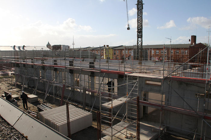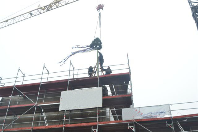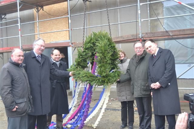 Die erste Etappe ist geschafft: Der Rohbau ist fertig gestellt. Feierlich zogen die Handwerker heute die Richtkrone mit einem Baukran auf das Dach des Neubaus vom LAVES-Institut für Fische und Fischereierzeugnisse in Cuxhaven. Carsten Zöllner, Leiter des Staatlichen Baumanagements in Cuxhaven, freute sich, dass das Richtfest für den zweistöckigen Rohbau nun gefeiert werden konnte. Ursprünglich war das Fest noch vor Weihnachten vorgesehen, doch durch den frühen Wintereinbruch hatten sich die Betonarbeiten verzögert.