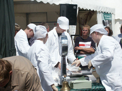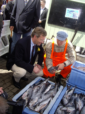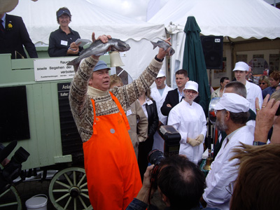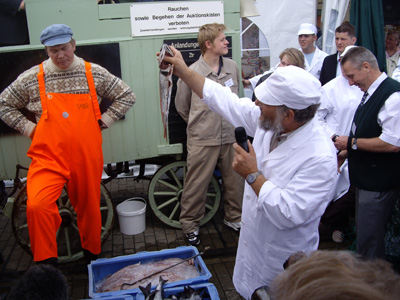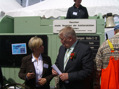 Zum Ersten, zum Zweiten und zum Dritten… Bei der großen Fischauktion in Cuxhaven haben Niedersachsens Ministerpräsident Christian Wulff und Landwirtschaftsminister Hans-Heinrich Ehlen beim Tag der Niedersachsen am Stand des LAVES am Sonnabend, 7. Juli, mehr als 50 Kilogramm Seelachsfilets zugunsten der Deutschen Seemannsmission e.V. versteigert. Der von der Cuxhavener Firma Kutterfisch gespendete Fisch brachte knapp 250 Euro ein.