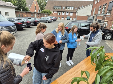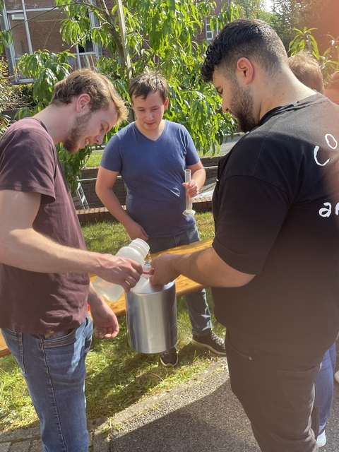 An dieser Station musste ein Liter Wasser über unterschiedliche Gefäße in einen Messzylinder befördert werden. Natürlich mit möglichst wenig Verlust! Die Krux: Alle Gefäße waren unterschiedlich groß, durften nicht abgestellt und nur mit einer Hand gehalten werden.