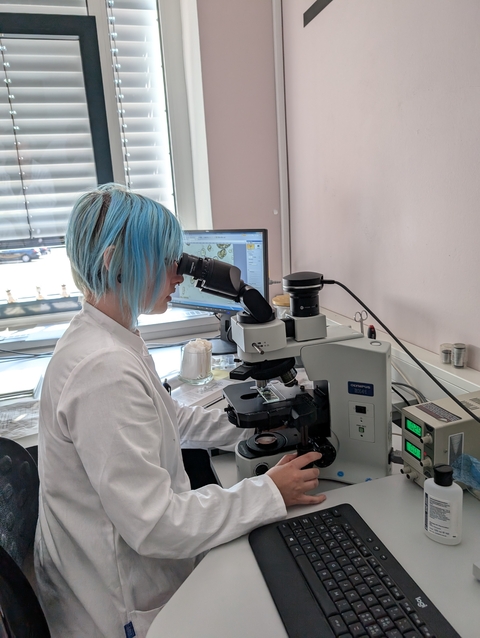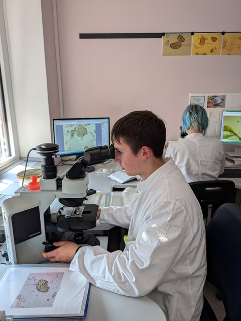 Die Auszubildenden führen mikroskopische Untersuchungen und Abstriche von Futtermittelproben durch.