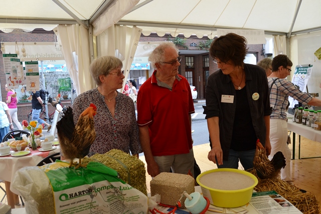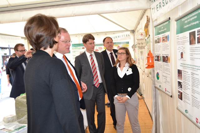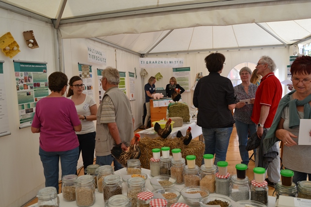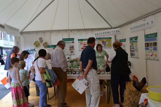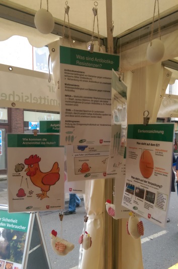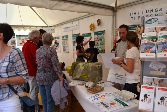 Für den gesundheitlichen Verbraucherschutz sind viele Aspekte relevant. Über die wichtigsten Themen rund um Huhn und Ei konnten sich die Besucher beim Tag der Niedersachsen am LAVES-Stand informieren. Zum Beispiel präsentierten Futtermittelkontrolleure diverse Rohstoffe und deren Zusammensetzung in Mischfutter und erklärten ihre tägliche Arbeit. Mitarbeiter der Tierarzneimittelüberwachung informierten darüber, wie Arzneimittel ins Huhn kommen, was eigentlich Antibiotikaresistenzen sind und wie der Antibiotikaeinsatz reduziert werden könnte. Der Tierschutzdienst erläuterte die verschiedenen Haltungsformen von Legehennen und erklärte, was Verbraucher bereits heute beim Eierkauf für mehr Tierwohl beachten können. Der Tierschutzdienst des LAVES griff dabei auch den Tierschutzplan des Niedersächsischen Ministeriums für Ernährung, Landwirtschaft und Verbraucherschutz auf, der sich zum Beispiel für den Verzicht des Schnabelkürzens bei Hühnern einsetzt.
