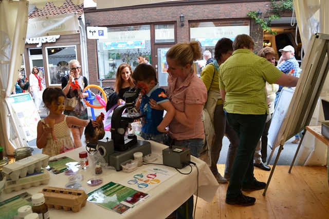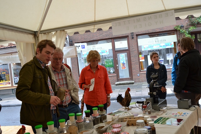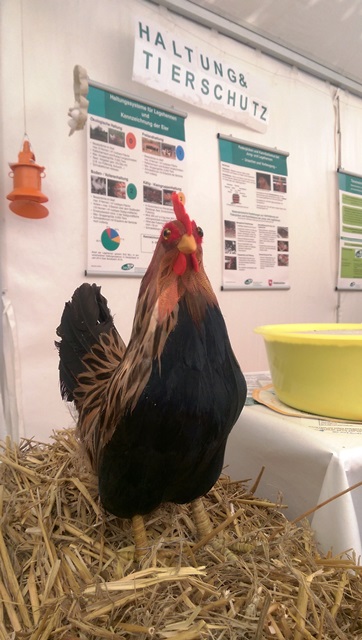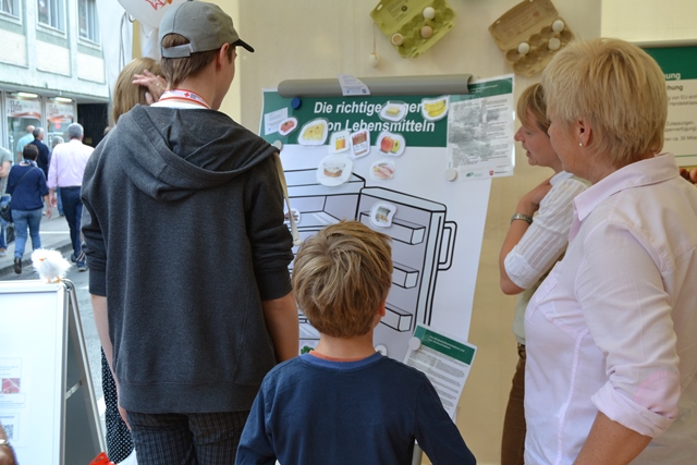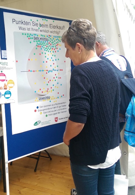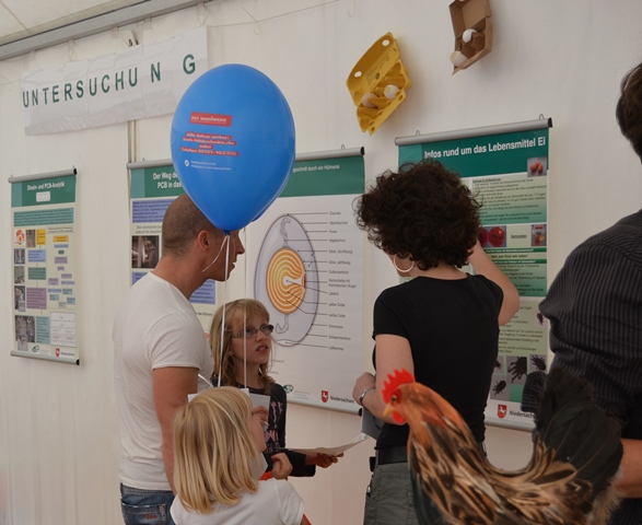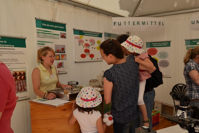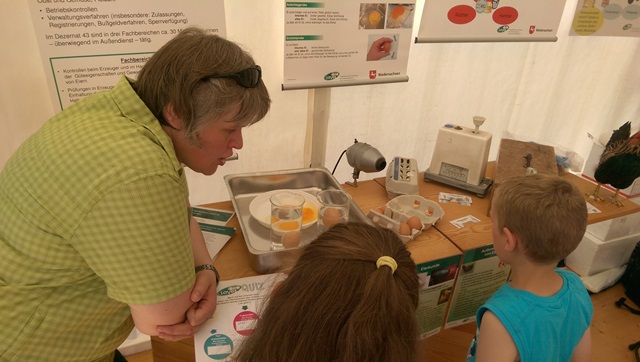 Einblicke in die Laborarbeit der LAVES-Institute waren ebenfalls möglich: Ein Blick durch das Mikroskop zeigte winzig kleine Vogelmilben, die Legehennen als Parasiten befallen können. Für den praktischen Frischetest zu Hause wurde ein Trick mit einem Wasserglas gezeigt, in dem man ein Ei schwimmen lässt, um die Frische zu überprüfen. Außerdem gab es viele weitere Informationen zu Güteklassen bei Eiern, Salmonellen, Dioxin und Lebensmittelhygiene sowie zu den Ausbildungsmöglichkeiten beim LAVES und zum Verbraucherinformationsgesetz. Für Kinder wurde ebenfalls einiges geboten: Sie konnten an einem Quiz teilnehmen und sich als Gewinn ihren ganz persönlichen Button basteln.
