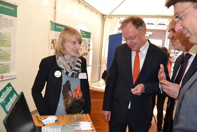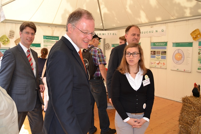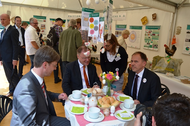 Unter dem Motto: „Vom Huhn zum Ei auf dem Frühstückstisch“ – informierten die Mitarbeiter des Niedersächsischen Landesamtes für Verbraucherschutz und Lebensmittelsicherheit (LAVES) am 34. Tag der Niedersachsen in Hildesheim rund um den gesundheitlichen Verbraucherschutz. Vom 26. bis zum 28. Juni 2015 lud das LAVES die Besucher an den gedeckten Frühstückstisch und gab Einblicke in die Themenschwerpunkte Huhn und Ei, speziell zu Futtermittel, Tierhaltung, Tierschutz, Antibiotika, Kennzeichnung, Untersuchung und Hygiene. Der Stand des LAVES war an allen drei Tagen sehr gut besucht und zog mit seinen verbraucherorientierten Themen und der kreativen Standgestaltung viele Interessenten an. Auch der niedersächsische Ministerpräsident Stephan Weil wählte für seinen Rundgang beim Tag der Niedersachsen den LAVES-Stand als Station aus und ließ sich zusammen mit Hildesheims Oberbürgermeister Dr. Ingo Meyer am Frühstückstisch nieder.