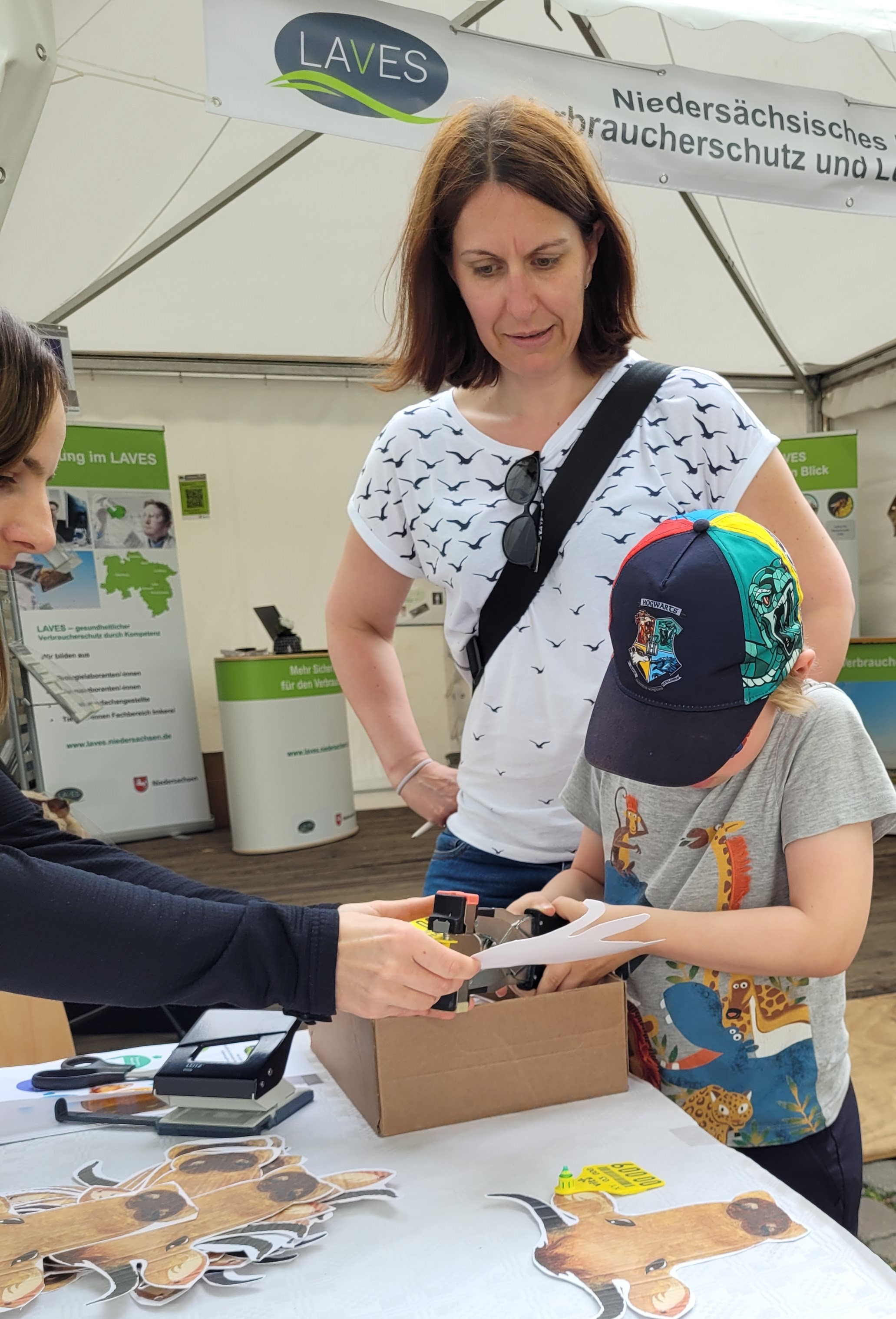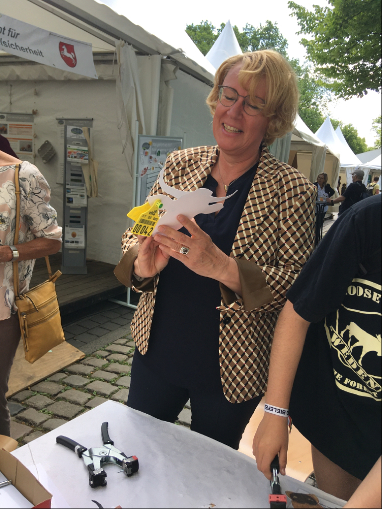 Ein weiteres Highlight war die Rinderkopf-Aktion. Wer bei unserem Quiz fünf Fragen zu Lebensmitteln und Tieren richtig beantworten konnte, durfte zur Belohnung einen Rinderkopf aus Papier ausschneiden und diesen mit einer gelben Ohrmarke vesehen. Das kam sehr gut an und war ein großer Spaß für jedes Alter. Dabei konnten wir viel Wissenswertes über die Ohrmarken und die Untersuchungen des LAVES vermitteln. Insbesondere Kinder und Jugendliche waren sehr neugierig und nahmen den selber gebastelten Rinderkopf stolz als Andenken mit nach Hause.