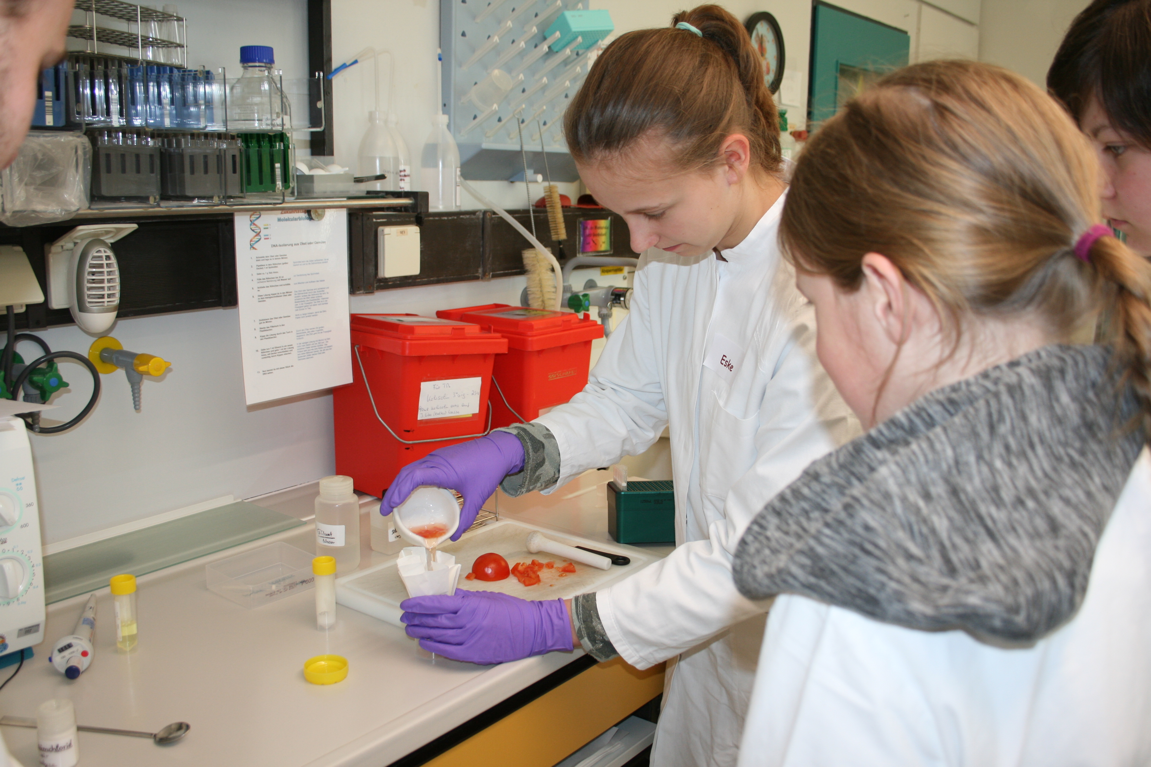 Und schon war der Labortag wieder vorbei. In der Feedbackrunde erzählten die Schülerinnen und Schüler, dass ihnen alles sehr gut gefallen habe, am besten fanden sie die mit bloßem Auge sichtbare Tomaten-DNA.