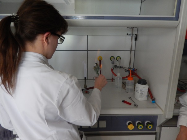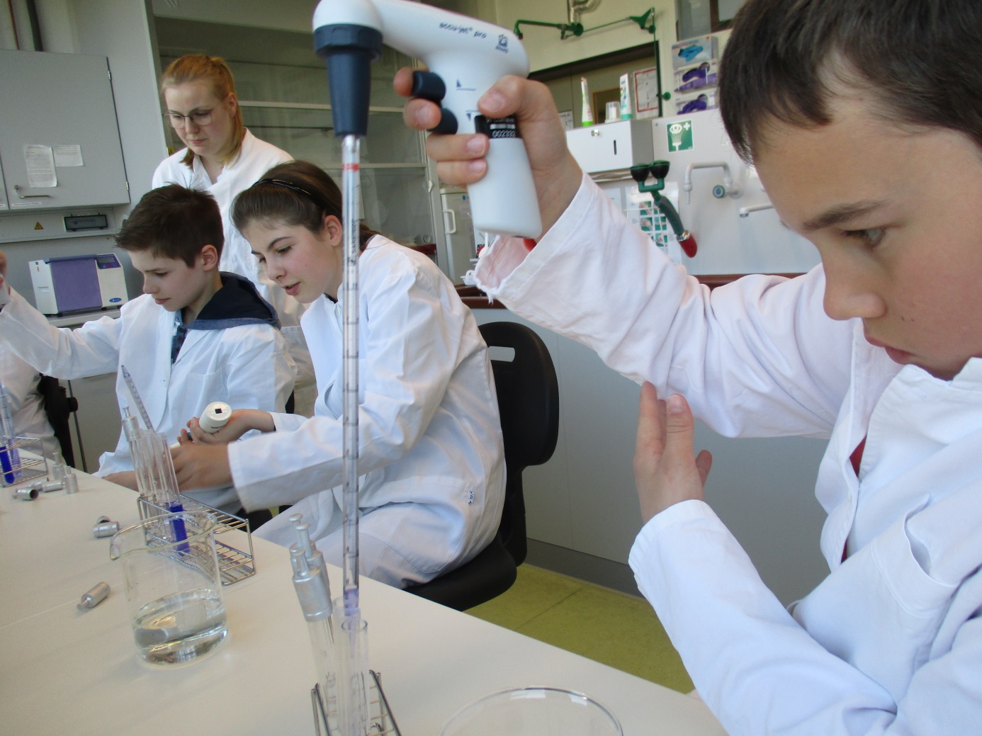 Anschließend teilten sie sich in 2 Gruppen auf, um verschiedene Experimente durchzuführen. Nach einer Sicherheitseinweisung über die Gefahrensymbole und die Sicherheitsvorkehrungen im Labor durften die Jugendlichen dann endlich im Labor selber los legen.