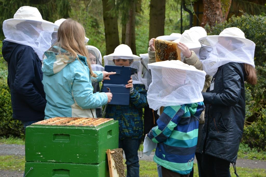 Dann ging es in den Institutsgarten, um gemeinsam in ein Bienenvolk hineinzuschauen. Dabei war schnell die Scheu genommen und wie selbstverständlich haben die begeisterten Jugendlichen Wabe für Wabe sich das Leben der Bienen im Bienenkasten angeschaut. Die Geburt einer jungen Biene war besonders spannend. Viele interessierte Fragen konnten beantwortet werden – hierbei fiel auf, was die Schüler schon an Wissen mitgebracht haben.