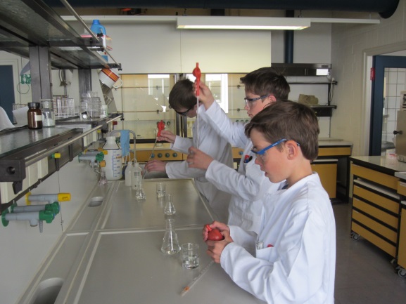 Schon etwas mehr feinmotorisches Geschick mussten die beiden bei einer Säure-Base Titration mit der Bürette aufwenden, um den Moment des Farbumschlags der Lösung in Rot exakt zu bestimmen.