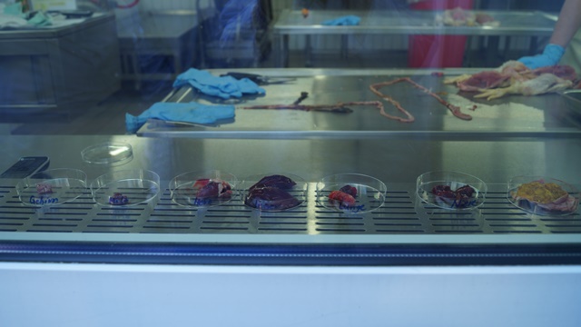 Nach einer kurzen Pause begann eine pathologische Demonstration. Dort konnten die Kinder durch eine Glasscheibe beobachten, wie in der Sektionshalle ein Huhn seziert wurde. Einzelne Organe konnten betrachtet und viele Fragen geklärt werden. Über einen Lautsprecher wurde der Vorgang erklärt.