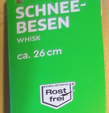 Am Beispiel eines Lebensmittelkontaktmaterials, hier ein Schneebesen, soll einmal eine Messung mit Ergebnis veranschaulicht werden. Das Messprinzip eignet sich neben den Spielwaren aus Kunststoff auch sehr gut für Gegenstände aus Metall, wobei natürlich auch Spielwaren Teile aus Metall enthalten können. Im Beispiel ist auf dem Produkt eine wertgebende Angabe zum Material zu sehen: „Edelstahl – rostfrei“. Als Edelstahl rostfrei wird ein Werkstoff aus Metall verstanden, der neben Eisen als Hauptkomponente noch Chrom und Nickel in vorgegebenen Anteilen enthält. Es handelt sich um einen hochwertigen Werkstoff, der aufgrund seiner guten Eigenschaften insbesondere im Bereich von Lebensmittelkontaktmaterialien häufig Verwendung findet. Die Vorgaben besagen, dass der Anteil an Chrom 18 % und der von Nickel 10 % betragen muss, damit die Bezeichnung verwendet werden darf.