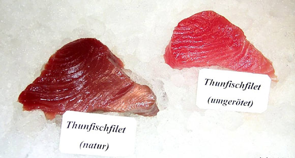 In den vergangenen Jahren wurden auf dem Fischmarkt vermehrt rotfleischige Fischarten entdeckt, die zuvor mit Kohlenmonoxid oder mit kohlenmonoxidhaltigem Rauch behandelt worden waren. Diese Behandlung dient der Stabilisierung der roten Farbe des Fleisches und verhindert die während der Alterung eintretende braun-graue Verfärbung. Das Farbenspiel erinnert an das von reifen Himbeeren oder von frisch geschnittenem Melonenfruchtfleisch als an die natürliche Färbung von Thunfisch. Die Verderbnisprozesse im Fischfleisch werden jedoch durch dieses Verfahren nicht beeinflusst und es besteht die Gefahr, dass die intensive und lange anhaltende Rotfärbung eine nicht mehr vorhandene Frische vortäuscht.