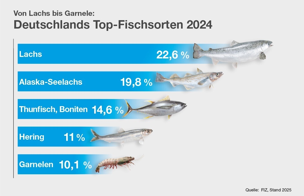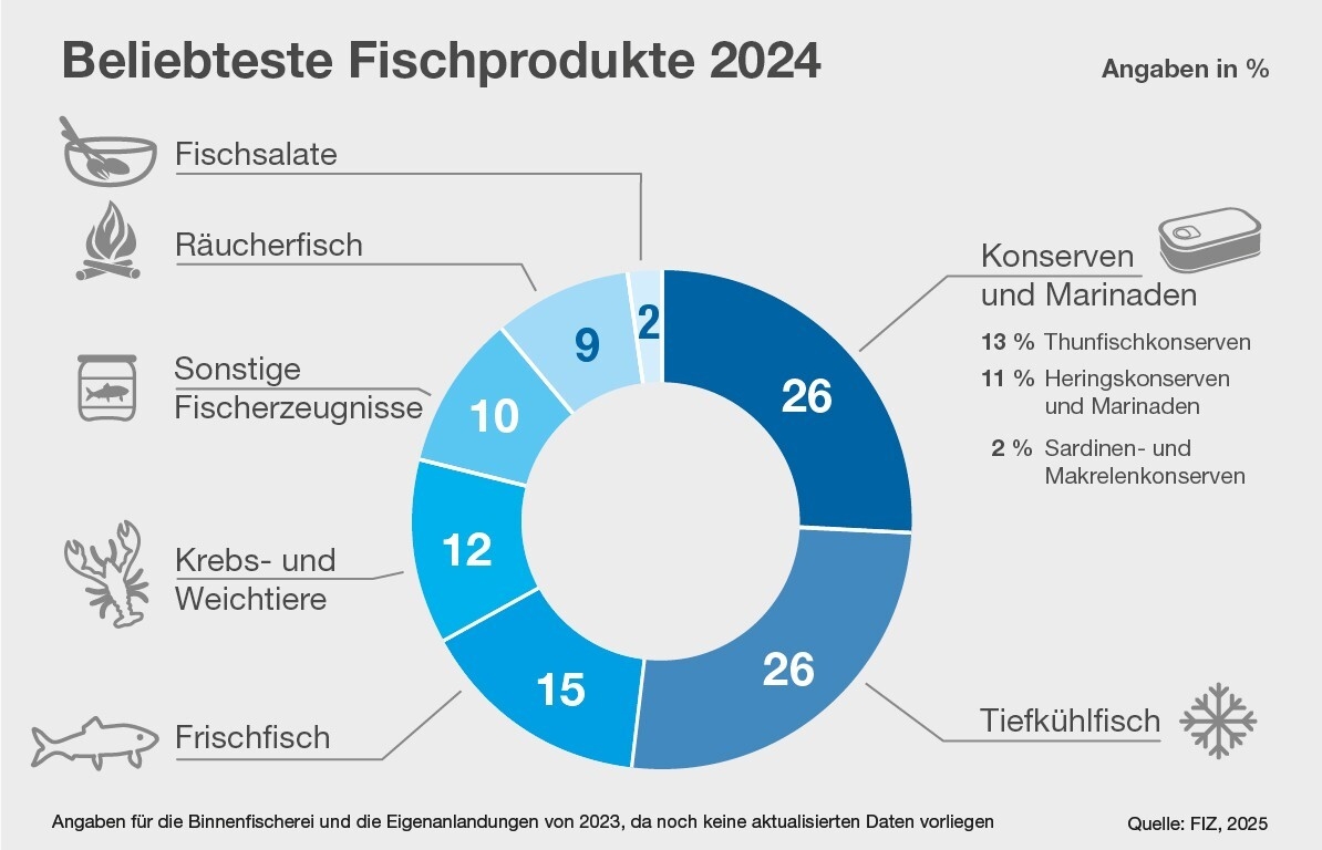 In Deutschland wird das Gesamtaufkommen an Fisch und Fischereierzeugnissen von etwa 1,05 Mio. Tonnen (2024) zu etwa 88 Prozent über Importe abgedeckt, der geringere Teil über Eigenanlandungen oder Eigenproduktion, einschließlich Binnenfischerei und Aquakultur. Der Pro-Kopf-Verzehr von Fisch ist in Deutschland auf 12,5 Kilogramm pro Jahr gesunken (siehe www.fischinfo.de).