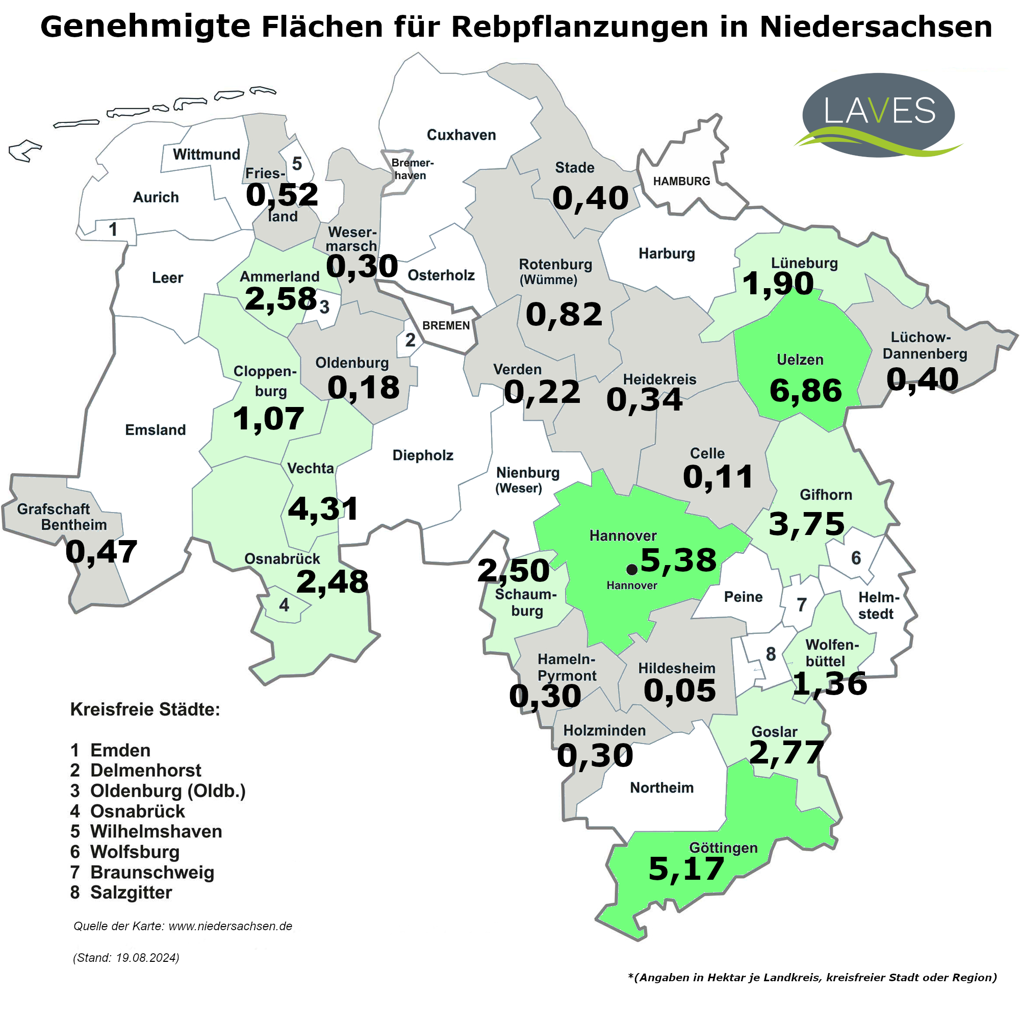 Die von 2016 bis 2024 bewilligten Flächen verteilen sich wie folgt auf die niedersächsischen Landkreise, kreisfreien Städte sowie die Region Hannover: