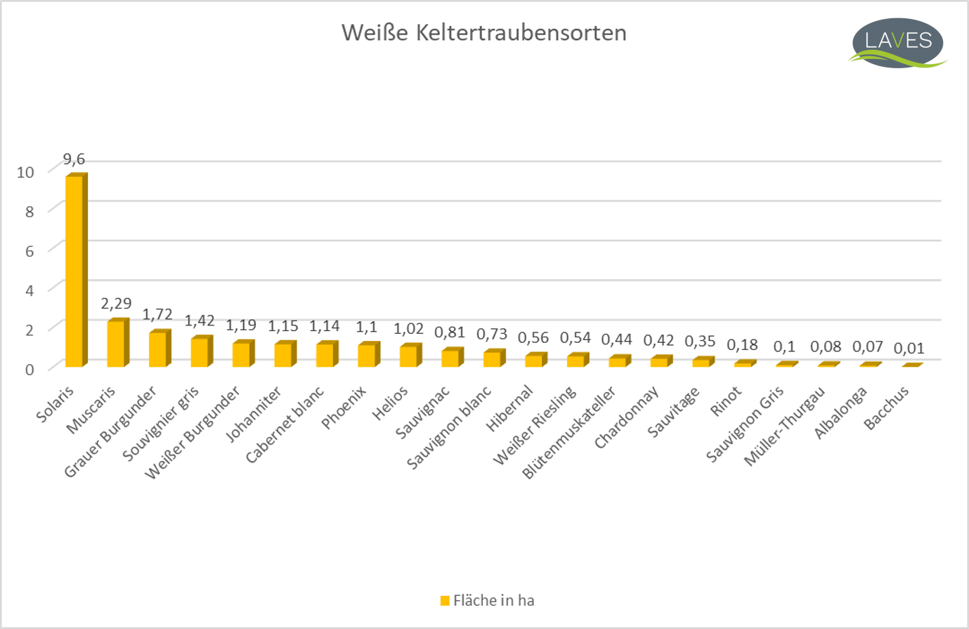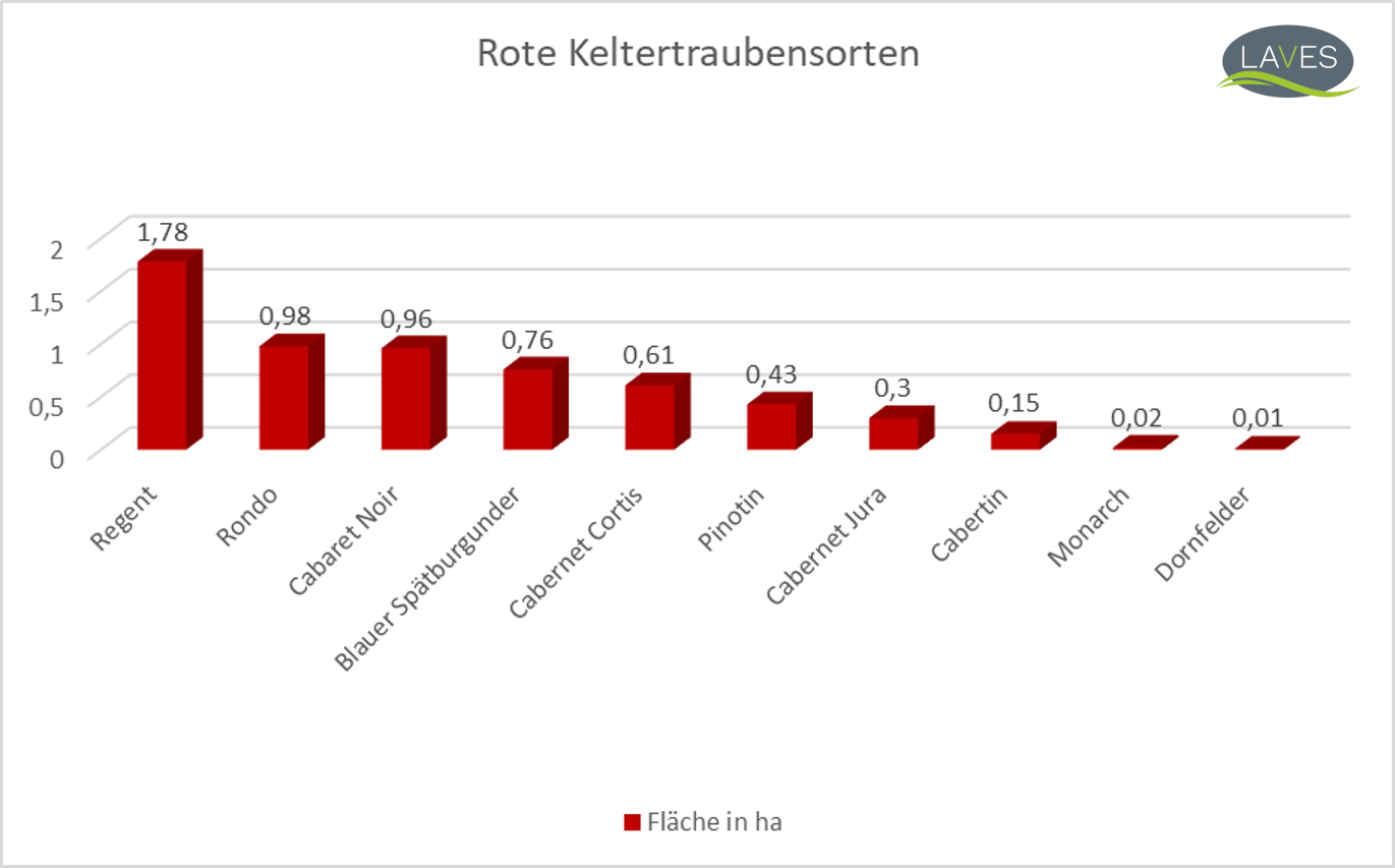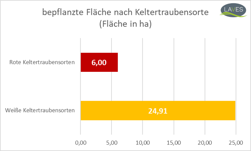 In Niedersachsen werden momentan (Stand Rebflächenmeldung 05.01.2024) deutlich mehr Reben für weiße als für rote Keltertrauben angebaut. Auf insgesamt sechs ha Rebfläche wachsen zehn verschiedene Sorten rote Keltertrauben, der Hauptanteil entfällt auf die Sorten Regent (1,78 ha), Rondo (0,98 ha) und Cabaret Noir (0,96 ha). Der größere Flächenanteil entfällt mit 24,91 ha auf die weißen Keltertraubensorten, wovon insgesamt 21 verschiedene Sorten angepflanzt werden. Hier sticht die Sorte Solaris (9,6 ha) heraus, während Muscaris (2,29 ha) und Grauer Burgunder (1,72 ha) jeweils nicht einmal ein Viertel der Fläche des Solaris erreichen. Von den übrigen 18 Sorten weißer Keltertrauben wird aktuell keine auf mehr als 1,42 ha angebaut.