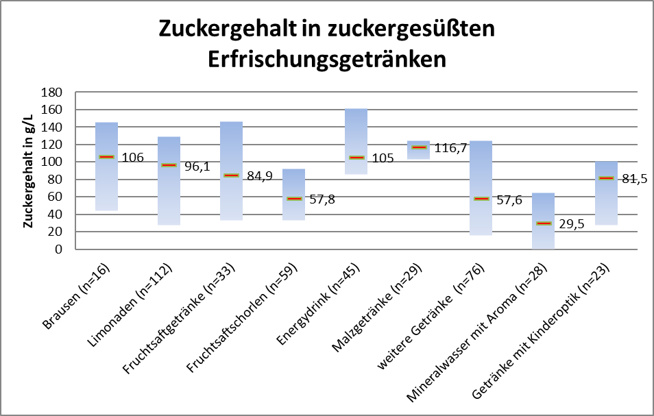 Im Rahmen der amtlichen Lebensmittelüberwachung werden im LAVES im Lebensmittel- und Veterinärinstitut Hannover/Braunschweig am Standort Braunschweig circa 500 Erfrischungsgetränke pro Jahr untersucht. Ein Untersuchungsschwerpunkt liegt in der Ermittlung des Zuckergehaltes dieser Getränke und Überprüfung der Nährwertkennzeichnung. Die Proben werden von den kommunalen Behörden risikoorientiert bei ansässigen Herstellern, im Handel und der Gastronomie entnommen. Bei den dargestellten Ergebnissen handelt es sich somit nicht um eine systematische Marktanalyse, sondern um die Ergebnisse der nach dem Stichprobenprinzip zur Untersuchung eingereichten Proben. Prozentuale Anteile am Markt können davon nicht abgeleitet werden.