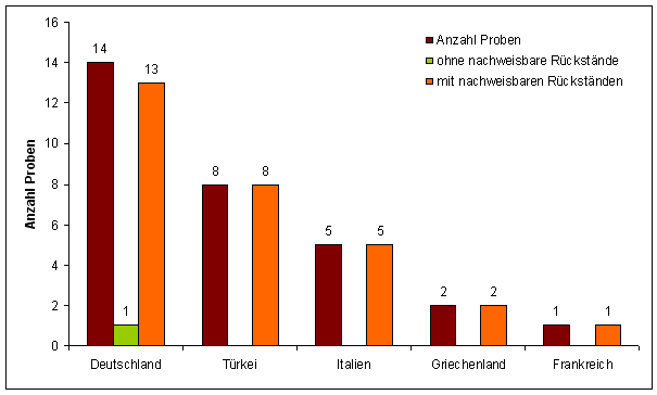 Lediglich eine Probe aus Deutschland enthielt keine nachweisbaren Pflanzenschutzmittelwirkstoffe. Rückstände oberhalb der rechtlich festgelegten Höchstgehalte wurden in keiner Probe festgestellt.