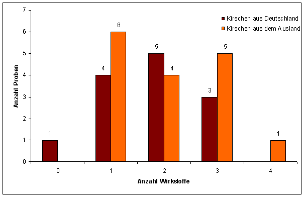In 64% der deutschen Proben und 63% der Kirschen aus dem Ausland wurden Mehrfachrückstände, d. h. 2 oder mehr Wirkstoffe je Probe bestimmt (Abbildung 2). Eine Kirschprobe aus Griechenland enthielt 4 verschiedene Wirkstoffe.