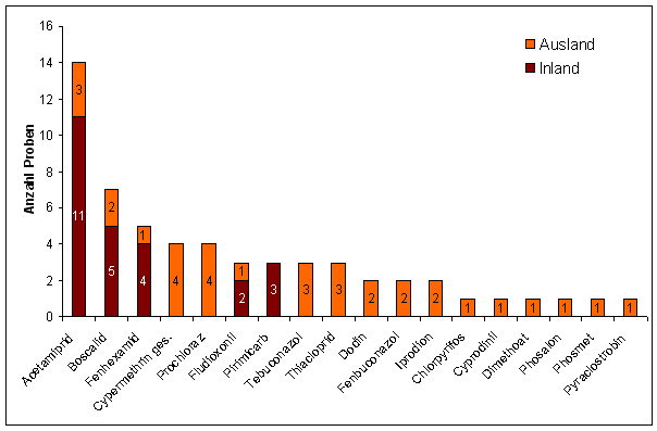Insgesamt wurden in den Proben aus dem In- und Ausland 18 verschiedene Wirkstoffe nachgewiesen (Abbildung 3), davon enthielten die deutschen Kirschproben nur fünf verschiedene Pflanzenschutzmittelwirkstoffe. Am häufigsten war das Insektizid Acetamiprid (14x), das zur Bekämpfung der Kirschfruchtfliege eingesetzt wird, in den Süßkirschenproben enthalten.