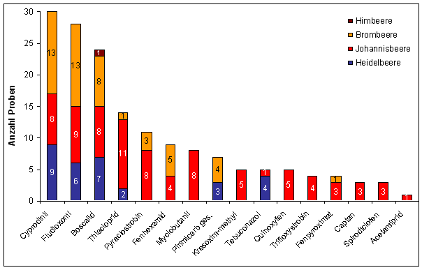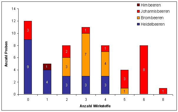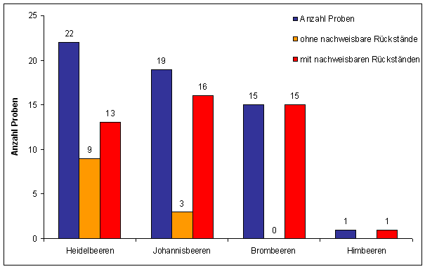 In 9 Heidelbeer- und 3 Johannisbeerproben konnten keine Rückstände von Pestiziden nachgewiesen werden, darunter die 2 Proben aus ökologischem Anbau. Keine der untersuchten Brombeerproben war rückstandsfrei (siehe Abbildung 1).