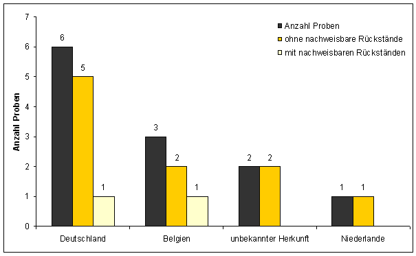 6 Proben kamen aus Deutschland, 3 Proben aus Belgien und eine Probe aus den Niederlanden. Bei zwei weiteren Proben war das Herkunftsland nicht bekannt. Einen Überblick über die Ergebnisse der Rückstandsuntersuchungen ist in Abbildung 1 dargestellt.