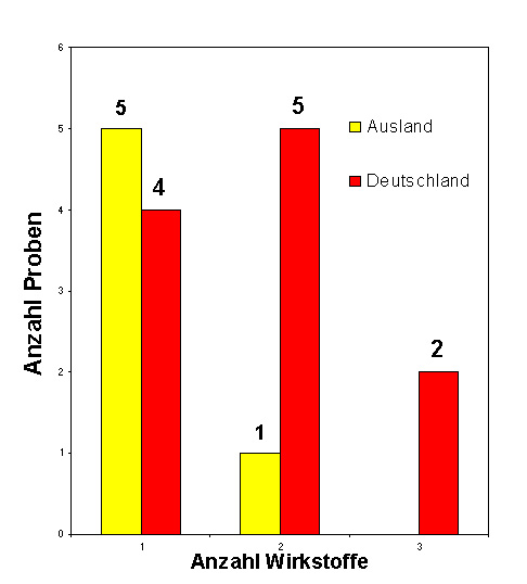In den deutschen Proben wurden ein bis drei Wirkstoffe gefunden, in den ausländischen Proben wurde am häufigsten ein Wirkstoff nachgewiesen.