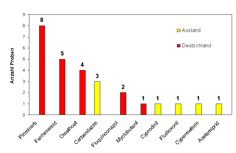 In Abbildung 3 ist die Häufigkeit der nachgewiesenen Wirkstoffe aufgeführt. In acht der elf Kirsch-Proben aus Deutschland wurde der Wirkstoff Pirimicarb nachgewiesen, Fenhexamid wurde in fünf Proben mit Herkunft Deutschland analysiert. In den ausländischen Proben wurde Carbendazim am häufigsten gefunden.