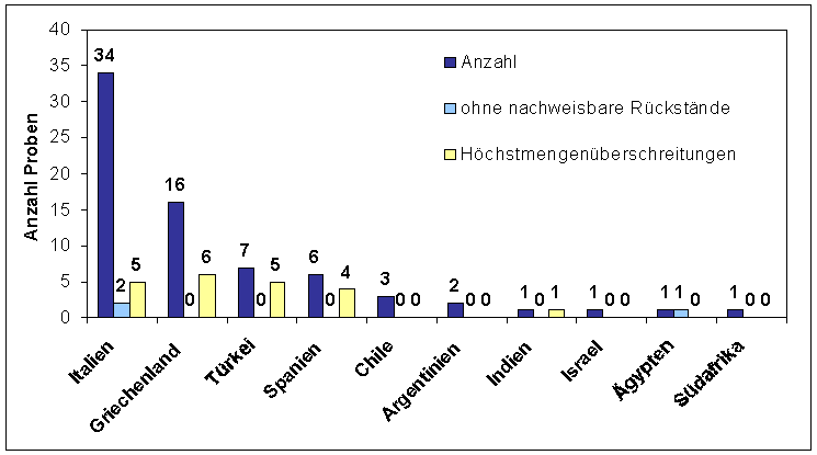 Die Proben mit Herkunft Chile, Argentinien, Indien, Israel, Ägypten, Südafrika sowie zwei spanische Proben wurden in der ersten Jahreshälfte entnommen. Die in der zweiten Jahreshälfte angeforderten Proben stammten aus Italien, Griechenland, der Türkei und Spanien.