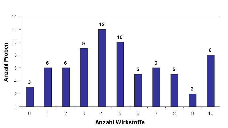 In den übrigen Proben wurden ein bis 10 Wirkstoffe bestimmt, die in Spuren gefundenen Wirkstoffe wurden dabei nicht berücksichtigt.