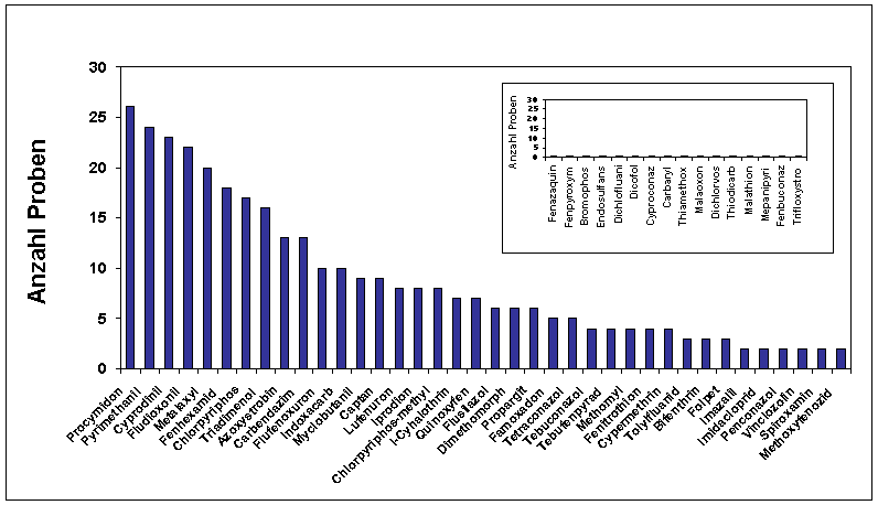In den 72 Tafeltrauben-Proben wurden insgesamt 54 verschiedene Wirkstoffe nachgewiesen. Die Wirkstoffe Procymidon, Pyrimethanil, Cyprodinil und Fludioxonil wurden am häufigsten bestimmt. Es handelt sich um Fungizide, die die Früchte vor Schimmelpilzbefall schützen sollen.