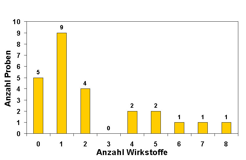 In fünf Proben (drei aus den Niederlanden und zwei aus Ungarn) konnten keine Rückstände an Pflanzenschutzmitteln nachgewiesen werden. Die übrigen Proben enthielten –ohne die in Spuren bestimmten Wirkstoffe- bis zu acht nachweisbare Rückstände (siehe Abbildung 2).