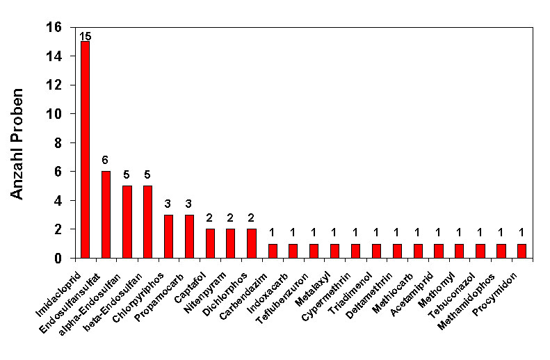 Die Häufigkeit der nachgewiesenen Wirkstoffe ist in Abbildung 3 aufgeführt. Das Insektizid Imidacloprid wurde am häufigsten bestimmt (in 15 Proben).