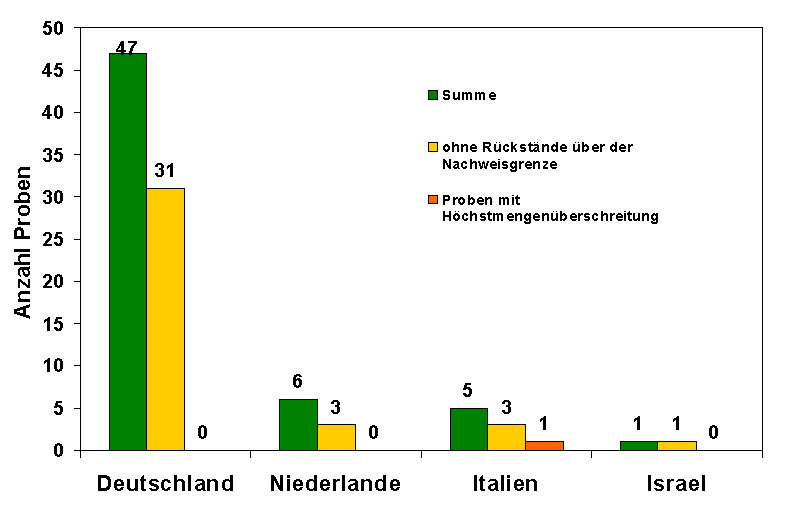 Etwa 80 % der Proben stammte aus Deutschland. Die übrigen Möhren-Proben hatten ihre Herkunft in den Niederlanden, Italien und Israel. Elf der 59 Proben stammten aus ökologischem Landbau.