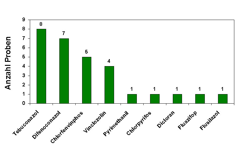 In lediglich 14 % der Proben wurden Mehrfachrückstände nachgewiesen. In einer Probe wurden drei Wirkstoffe gefunden, sieben Proben enthielten zwei nachweisbare Rückstände; in zwölf Proben konnte lediglich ein Wirkstoff gefunden werden (siehe Abbildung 2).