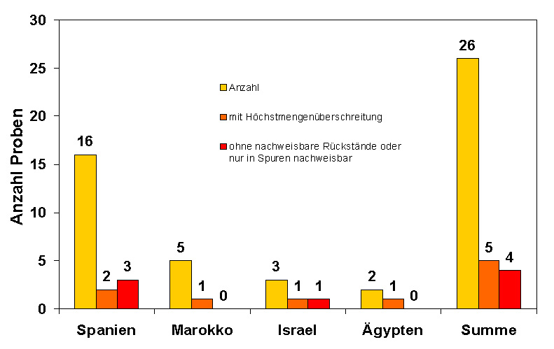 Höchstmengenüberschreitungen wurden in zwei spanischen Erdbeerproben und je einer Probe aus Marokko, Israel und Ägypten nachgewiesen. Es wurde jedoch lediglich die Probe aus Ägypten beanstandet, die übrigen Gehalte lagen noch innerhalb der Messunsicherheit.