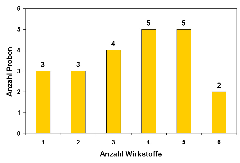 Am häufigsten wurden vier bis fünf Wirkstoffe in einer Probe gefunden.