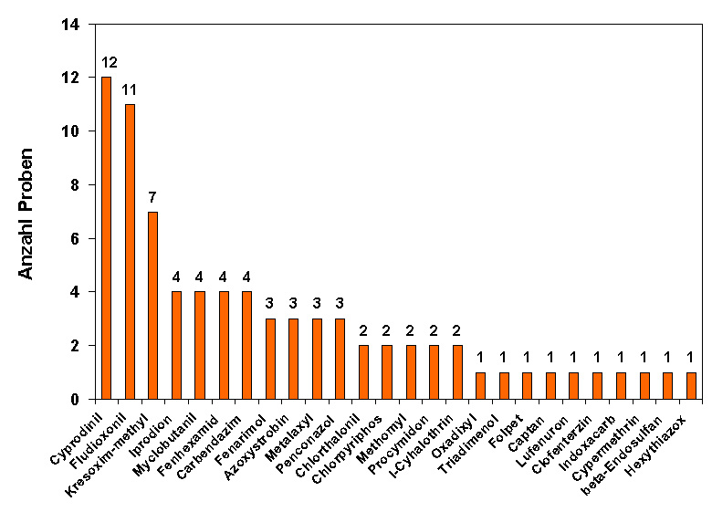 In den 26 Erdbeerproben wurden insgesamt 26 verschiedene Wirkstoffe gefunden. In Spuren nachgewiesene Pestizide wurden nicht berücksichtigt. Eine Übersicht über die Häufigkeit der nachgewiesenen Wirkstoffe zeigt Abbildung 3. Die Fungizide Fludioxonil, Cyprodinil wurden – wie auch im Vorjahr - am häufigsten bestimmt.