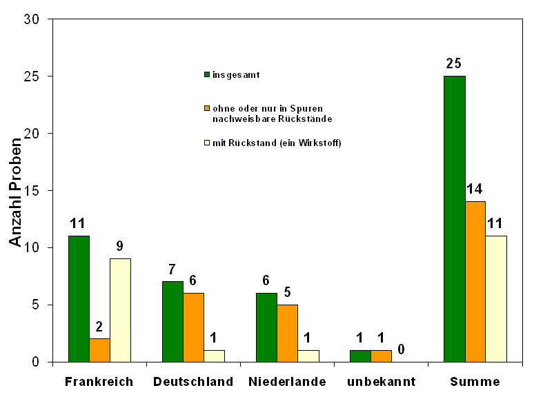 Die Proben stammten aus Frankreich, Deutschland und den Niederlanden. In knapp der Hälfte der Proben – insbesondere in deutschem und niederländischem Chicoree - konnten keine Rückstände nachgewiesen werden. Die übrigen Proben - insbesondere Chicoree aus Frankreich - enthielten jeweils lediglich einen nachweisbaren Wirkstoff (siehe Abbildung 1). In Spuren nachgewiesene Rückstände wurden nicht berücksichtigt.