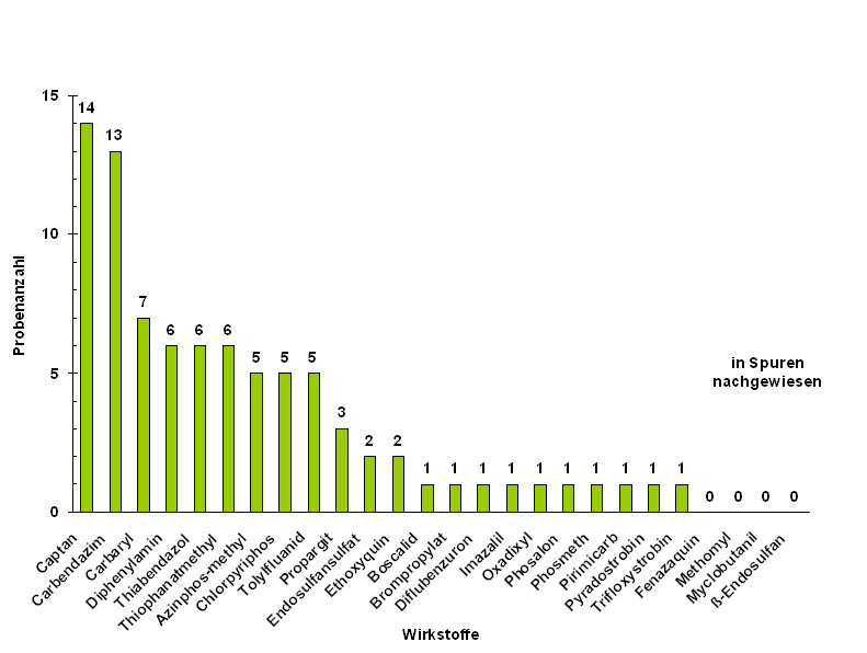 Die Fungizide Captan und Carbendazim wurden am häufigsten (jeweils knapp ein Drittel der Proben) nachgewiesen.