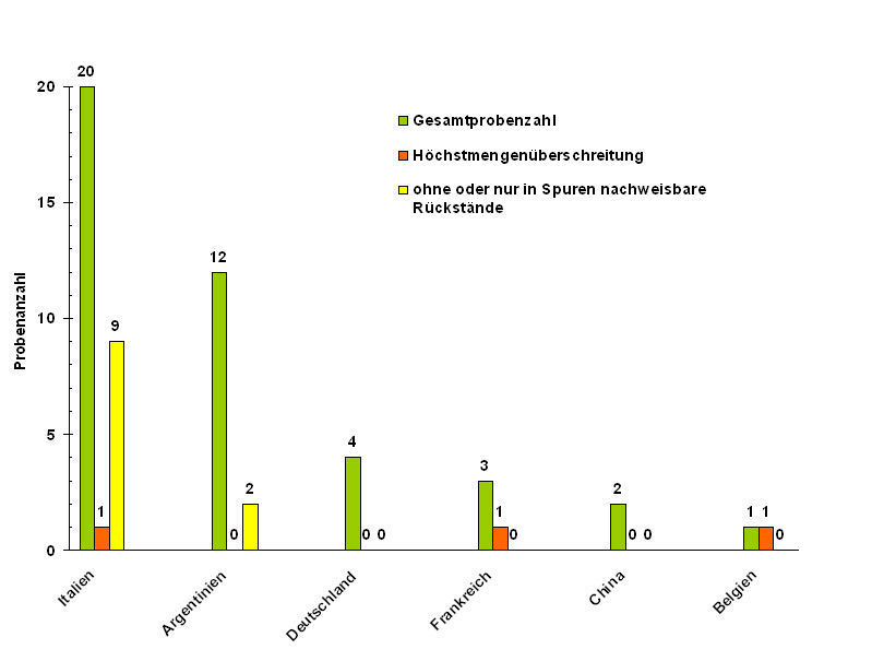 Rückstände oberhalb der rechtlich festgesetzten Höchstmengen wurden in drei ausländischen Proben festgestellt (siehe Abbildung 1).