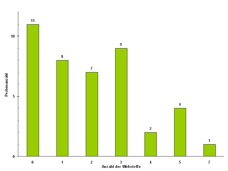 In den übrigen Proben wurden ein bis sieben Wirkstoffe nachgewiesen (Abbildung 2).