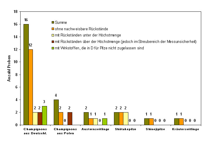 In über 70 % der Proben konnten keine Rückstände an Pestiziden nachgewiesen werden, jedoch wurden in vier Champignon-Proben - zwei aus Polen und zwei aus Deutschland - Höchstmengenüberschreitungen festgestellt, diese lagen jedoch noch im Streubereich der Messunsicherheit und wurden daher nicht beanstandet.