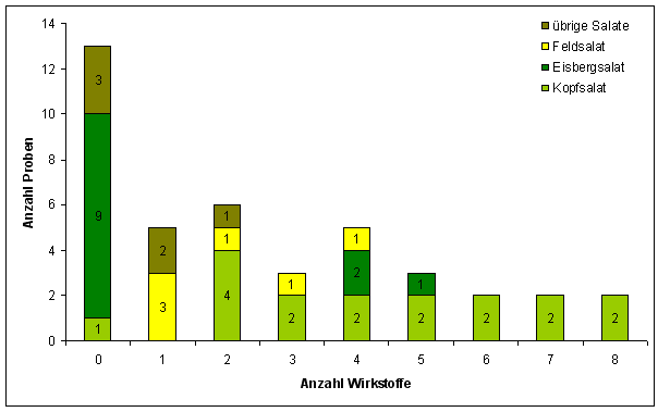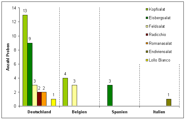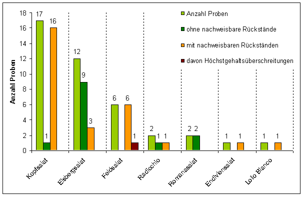 Im Lebensmittelinstitut Oldenburg des LAVES wurden im Jahr 2010 insgesamt 41 Salatproben aus konventionellem Anbau auf Pflanzenschutzmittelrückstände untersucht. Es handelte sich um 17 Proben Kopfsalat, 12 Proben Eisbergsalat, 6 Proben Feldsalat, jeweils 2 Proben Radicchio und Romanasalat sowie jeweils eine Probe Lollo Bianco und Endiviensalat.