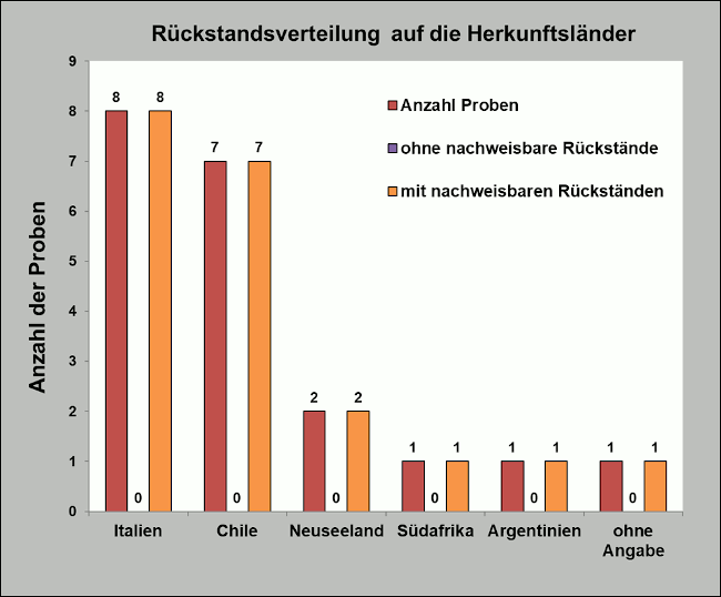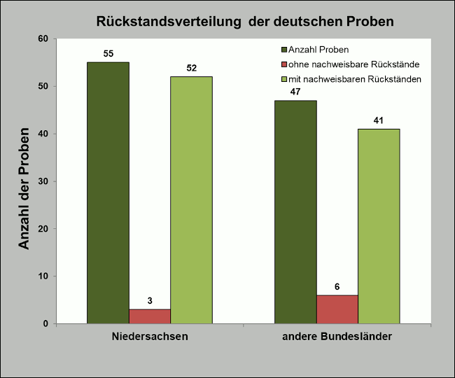 Die Ergebnisse der Rückstandsuntersuchungen der ausländischen Proben sind in Abbildung eins, die der deutschen Proben in Abbildung zwei zusammengefasst.
