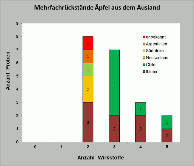 In den 20 ausländischen Apfelproben wurden zwischen zwei und fünf Wirkstoffe pro Probe nachgewiesen. Hauptsächlich wurden zwei Wirkstoffe bestimmt. Nur Proben aus Chile und Italien wiesen mehr Wirkstoffe auf, das Maximum lag hier bei fünf Wirkstoffen in jeweils einer Probe aus den beiden Ländern.