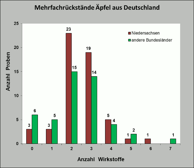 In 49 niedersächsischen Apfelproben (= 89 Prozent) wurden zwischen zwei und sechs Wirkstoffe nachgewiesen. 36 Proben (= 77 Prozent) aus anderen deutschen Bundesländern enthielten ebenso Mehrfachrückstände, das heißt es waren zwei oder mehr Wirkstoffe nachweisbar. Hauptsächlich wurden in den deutschen Proben zwischen zwei und drei Wirkstoffe bestimmt. Bezogen auf Niedersachsen lag der Wert bei 76 Prozent der Proben, bei den anderen deutschen Proben bei 62 Prozent. Sieben verschiedene Wirkstoffe von Pflanzenschutzmitteln bildeten das Maximum. Rückstandsfrei waren alle acht Proben aus biologischem Anbau sowie eine weitere Probe aus konventionellem, niedersächsischem Anbau.