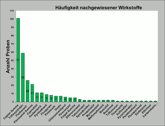 Die untersuchten Proben enthielten insgesamt 30 verschiedene Wirkstoffe. Am häufigsten bestimmbar waren die Fungizide Captan (101-mal), Trifloxystrobin (59-mal), Fludioxonil (26-mal) und das Insektizid Flonicamid (21-mal). Die Fungizide werden bei Kernobst unter anderem gegen Mehltau, Schorfbildung und Lagerfäulen eingesetzt. Das Insektizid findet Anwendung gegen Blattläuse.